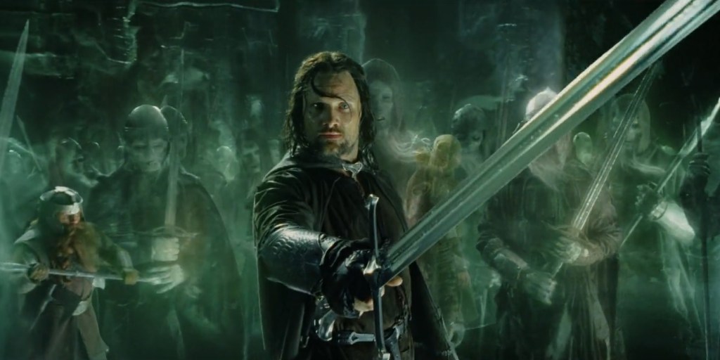 Aragorn’s song: When I think of RotK, this is always the first thing I think of. There’s something about it that’s so striking and unforgettable and joyous and so unique in mainstream cinema. There’s a great videocast called Cinema Therapy, about cinema and mental health, and in their wonderful episode entitled “Aragorn vs Toxic Masculinity” (see below; watch it with a box of tissues), they correctly identify this moment as one example of the many ways the character and Viggo’s performance dismantle action-hero stereotypes. Another genius move by all involved. I only wish it went on for more than half a verse.