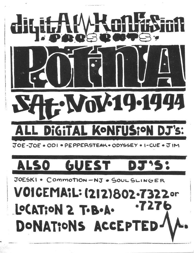 In August of 1994, a year after my first public gig, the sequel to that party took place on the same handball court uptown. By this time, Digital Konfusion had grown in success and influence and pulled a much bigger crowd. This was a great party, with the breakbeats, hard house and hip hop pumping and the court filled with ravers all the long humid night and well into the morning.