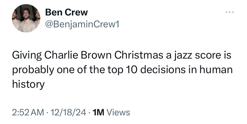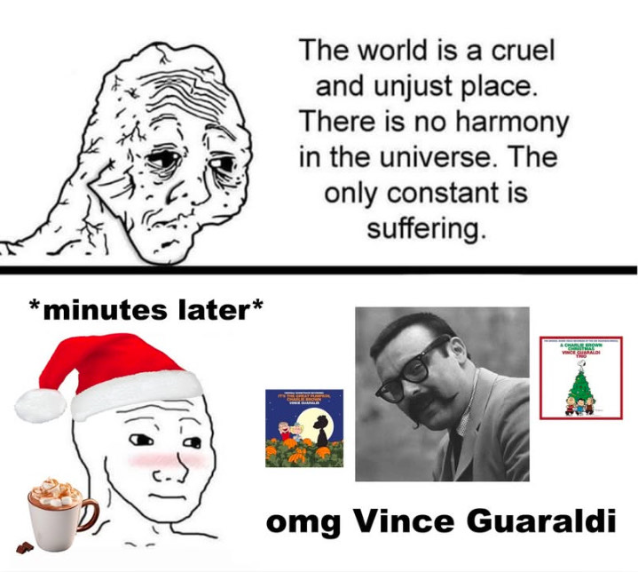 You probably don’t need convincing, so I won’t go on at length. It’s not just a collection of Christmas music, not just the soundtrack of a beloved holiday special, it’s a proper album that holds up as a listening experience. Its blend of smooth Latin-tinged jazz and midcentury holiday nostalgia is so perfect — the very grownup, very urban melancholy of the jazz instrumentals adding so much richness and depth to the Peanuts milieu, and with that children’s choir, somehow both heartwarming and haunting, elevating the whole thing. It’s all so good that the sublime, generation-defining banger “Linus and Lucy” doesn’t dwarf the other tracks as you might expect at first; the enchantment and delights keep flowing over the rest of the album, which I often listen to twice in a row.