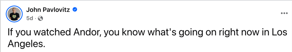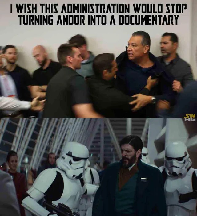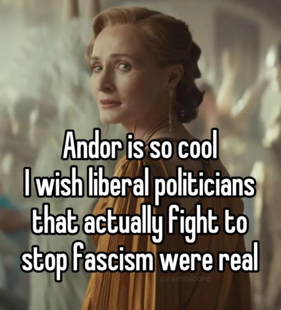 Just look at all the memes. If the sheer number of politically themed Andor memes were any measure, many viewers took the show seriously and applied it to real life — to Trump, to Gaza, and to the anti-ICE rebellion in Los Angeles. This as much as anything convinced me that Andor was worth discussing in more depth.