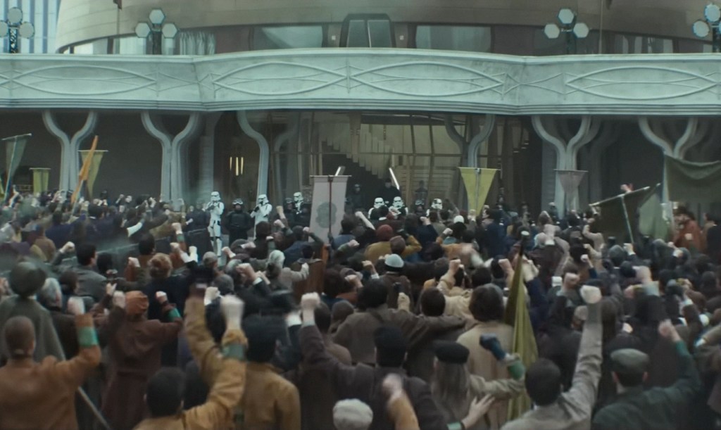 In fact, at times season 2 seems to be suggesting that mass protest is bad. There’s a murky subplot about the Imperial conspiracy to manipulate the Ghorman resistance so they can portray them as terrorists. This culminates in the sequence in which Imperial snipers fire into the crowd at a peaceful protest, turning it into a riot and bloodbath and scoring the needed propaganda points to justify genocide.