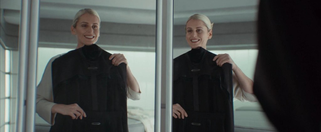 They argue that the modularity of the rooms relates to the fascist theme because it’s both seductive, in offering the dweller (or the viewer) a sense of strict, repetitive, comforting order; but also alienating because it does away with any individuality or quirkiness, making a home seem more like a prison cell. So Dedra (Gough) is, in the visual language of the filmmakers, imprisoned by the Empire as much as her victims are (and this foreshadows her own fate).