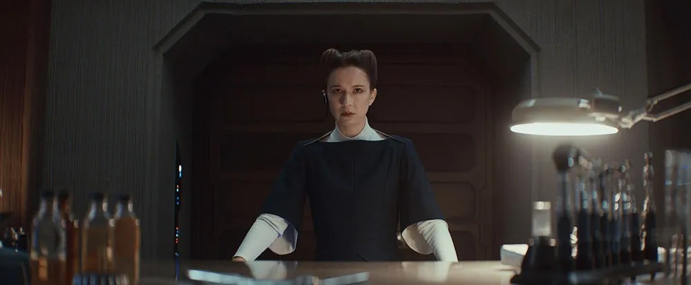 Some of the funniest and most unforgettable scenes are those in which Dedra and Syril Karn (Kyle Soller) host Syril’s mother Eedy for dinner at their apartment. The almost violently uptight Imperial supervisor and the clueless social-climbing bureaucrat, with their not-so-subtly dominant-submissive relationship, straining to seem like a normal domestic couple under the judgmental gaze of the pretentious and impertinent middle-class mother in their sterile modular apartment — here, Andor becomes a sitcom about life in a fascist society.
