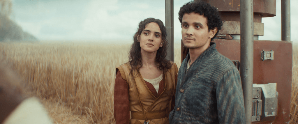 I was really impressed with how the scenes on the farming planet Mina-Rau foreground the issue of migrant labor and borders. Bix, Wilmon (Muhannad Ben Amor), Brasso (Joplin Sibtain) and several other Rebel comrades who escaped Ferrix after the uprising there at the end of season 1 are employed as laborers in the vast wheat fields of Mina-Rau as they hide out from the Empire. They live in constant fear of questioning or arrest if their undocumented status on the planet is discovered.