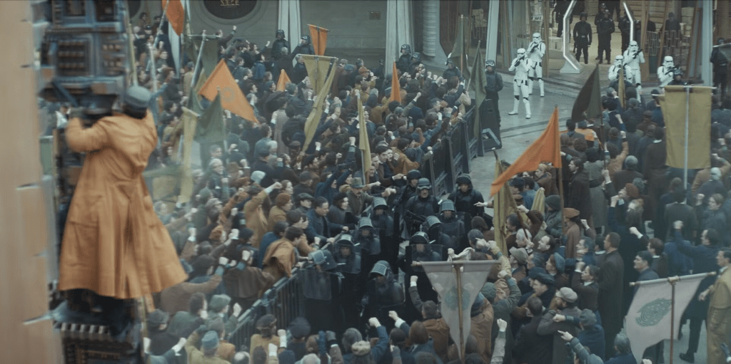 There’s political value in these filmmaking choices too: we see the crowd as human beings with a legitimate cause, not a blurry, indistinct angry mob of extremists, as the real-life news depicts most protests; and when the stormtroopers start firing into the crowd, it’s that much more shocking.