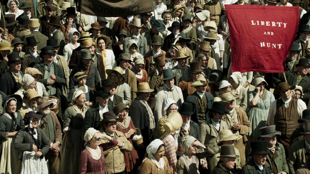 This sequence strongly reminded me of Peterloo, Mike Leigh’s 2018 fictionalized account of the Peterloo Massacre of 1819, a pivotal moment in British history and for the left worldwide.