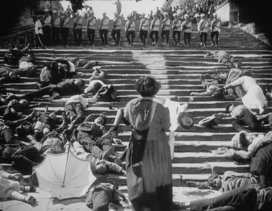 These scenes also clearly borrow from one of the greatest pieces of leftist filmmaking of all time, the famed Odessa Steps sequence in Soviet director Sergei Eistenstein’s Battleship Potemkin (1925). The stormtroopers descend the steps of the plaza, menacing and then attacking the protesters just as the Tsarist troops do in the silent classic.