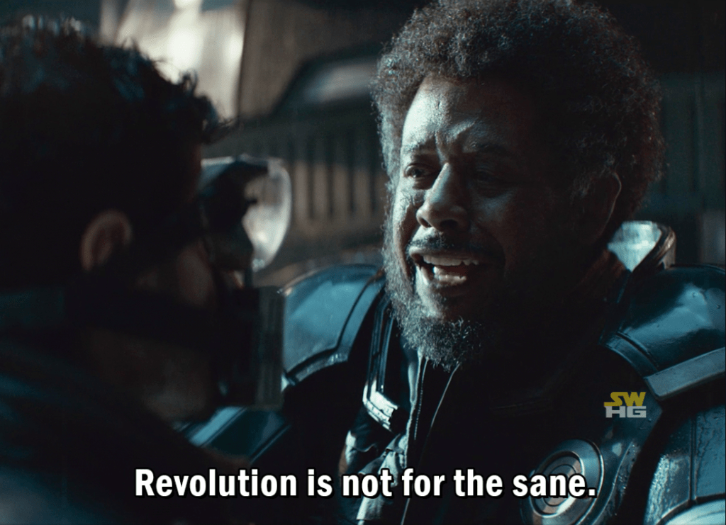 Amid all the other poignant references and allegories this season, the thing that quietly hit me hardest as a leftist is when Luthen says, “We fight to win. That means we lose, and lose, and lose, until we’re ready.” I just love this because it’s so true of real-world revolutionary organizing: if you’re in it for the long haul, you have to accept being marginalized and scorned and losing for a long time.